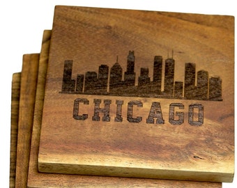 Chicago Illinois Skyline Wood Coaster Set Handmade Drink Etsy